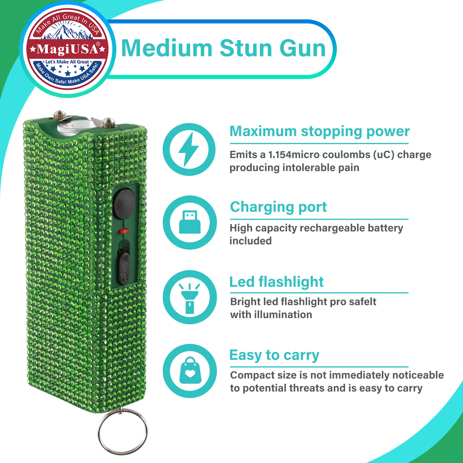 MagiUSA recently launched a new fashion collection of self-defense devices. The green bling-bling stun gun keychain set is designed for the daily use of vulnerable groups.
