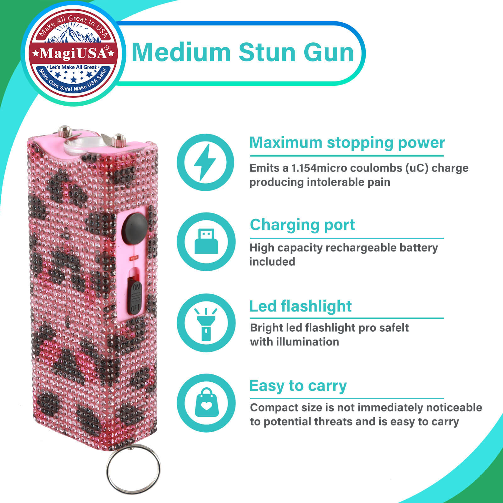 MagiUSA recently launched a new fashion collection of self-defense devices. The pink leopard bling-bling stun gun keychain set is designed for the daily use of vulnerable groups.